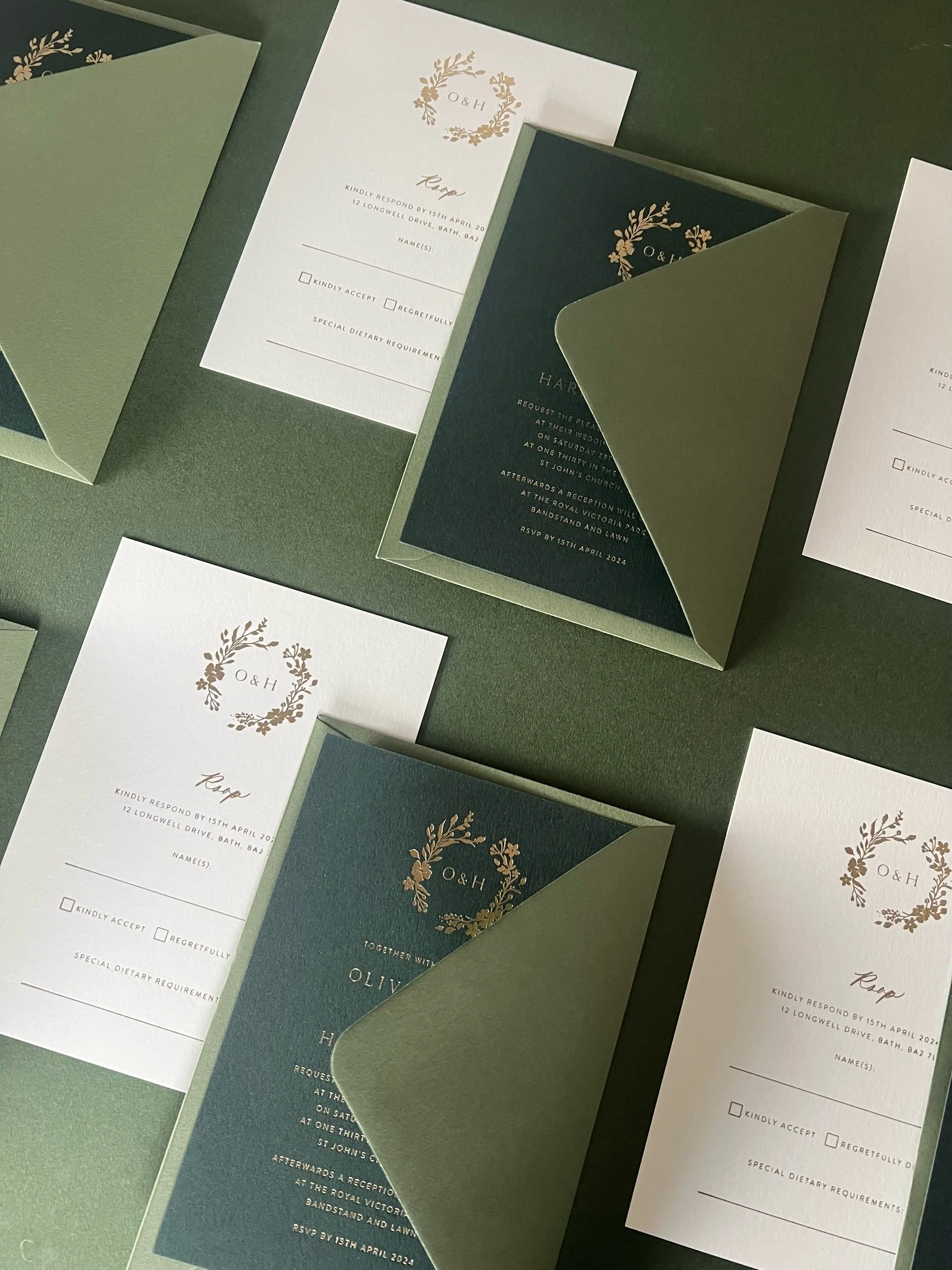 This wedding stationery collection incorporates a stunning hand illustrated wild flower wreath with your initials centred inside. Individually foil blocked in house the traditional way, by hand. If you would like to see a visual set up in your colours, please get in touch. This design can be foiled or digitally printed.